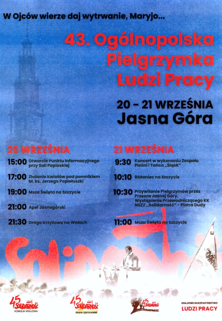W dniach 20-21 września odbędzie się doroczna, 43. Pielgrzymka Ludzi Pracy na Jasną Górę. W tym roku głównym organizatorem Liturgii jest Region Mazowsze NSZZ „Solidarność”, przy wsparciu Komisji Krajowej i Regionu Częstochowskiego NSZZ „Solidarność”.