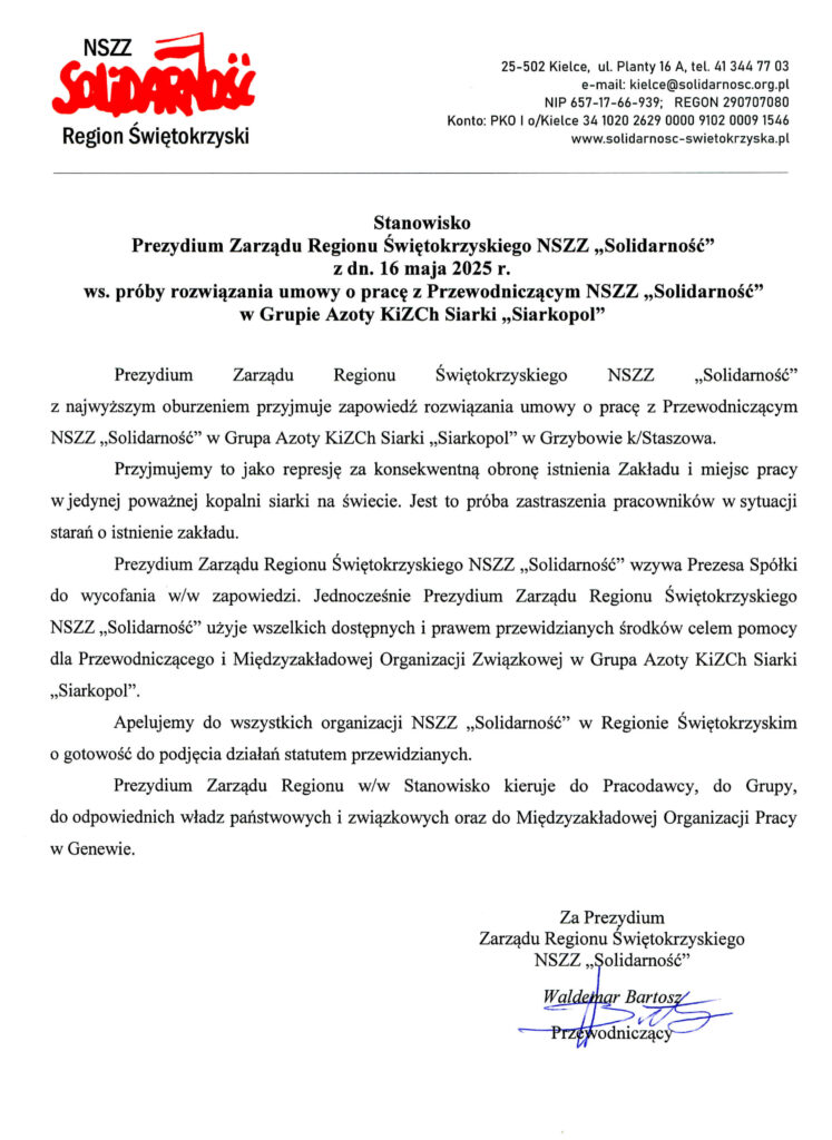 Prezydium Zarządu Regionu Świętokrzyskiego NSZZ „Solidarność” wzywa Prezesa Spółki do wycofania w/w zapowiedzi. Jednocześnie Prezydium Zarządu Regionu Świętokrzyskiego NSZZ „Solidarność” użyje wszelkich dostępnych i prawem przewidzianych środków celem pomocy dla Przewodniczącego i Międzyzakładowej Organizacji Związkowej w Grupa Azoty KiZCh Siarki „Siarkopol”.