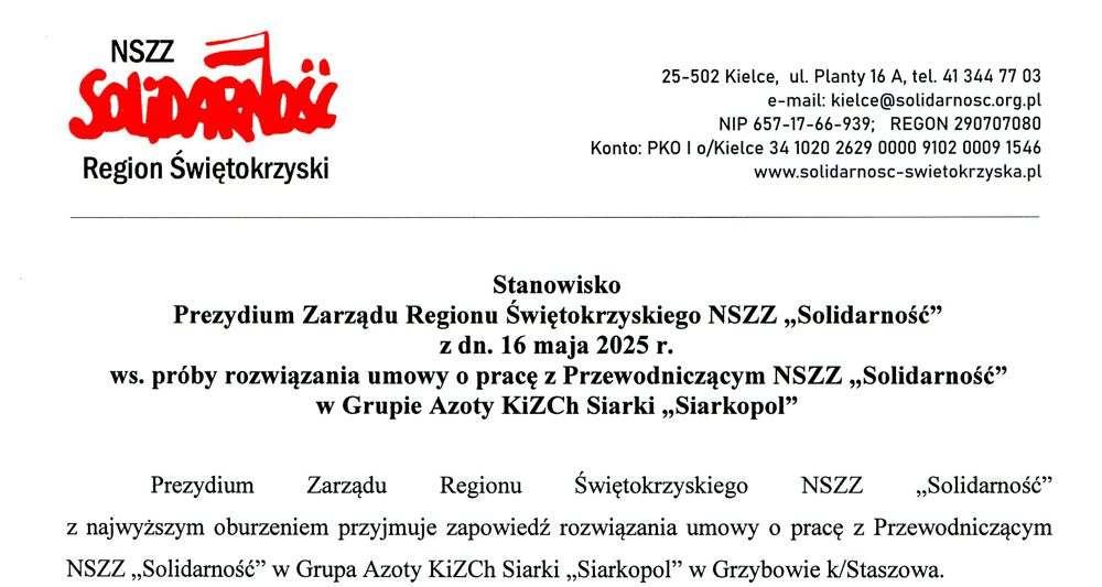 Prezydium Zarządu Regionu Świętokrzyskiego NSZZ „Solidarność” wzywa Prezesa Spółki do wycofania w/w zapowiedzi. Jednocześnie Prezydium Zarządu Regionu Świętokrzyskiego NSZZ „Solidarność” użyje wszelkich dostępnych i prawem przewidzianych środków celem pomocy dla Przewodniczącego i Międzyzakładowej Organizacji Związkowej w Grupa Azoty KiZCh Siarki „Siarkopol”.
