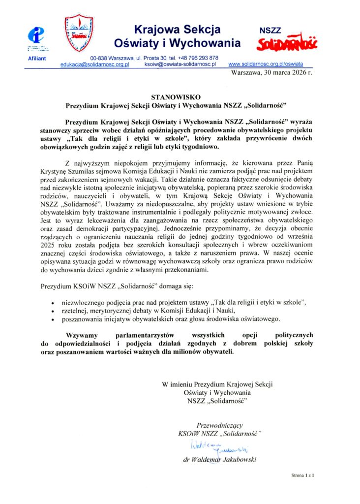 Prezydium Krajowej Sekcji Oświaty i Wychowania NSZZ „Solidarność” wyraża stanowczy sprzeciw wobec działań opóźniających procedowanie obywatelskiego projektu ustawy „Tak dla religii i etyki w szkole”, który zakłada przywrócenie dwóch obowiązkowych godzin zajęć z religii lub etyki tygodniowo.