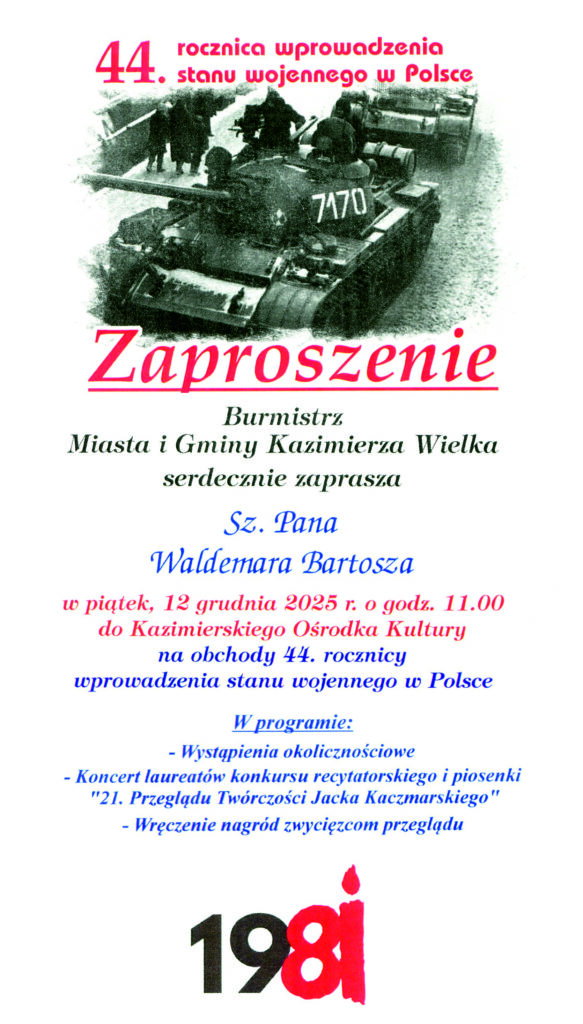 Kazimierskie obchody 44. rocznicy wprowadzenia w Polsce stanu wojennego są organizowane przez Burmistrza Miasta i Gminy Kazimierza Wielka w piątek 12 grudnia 2025r.