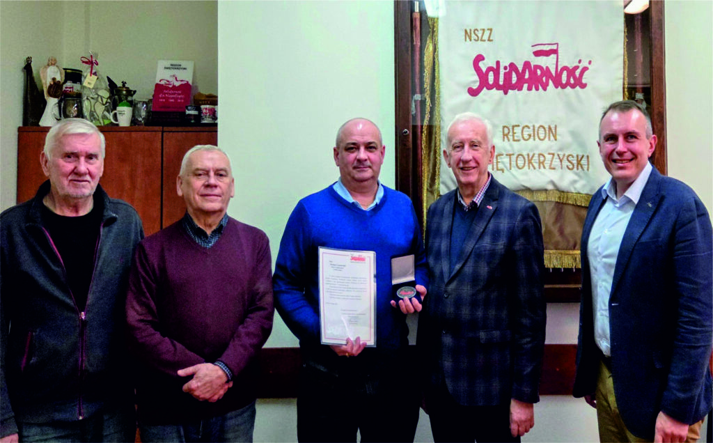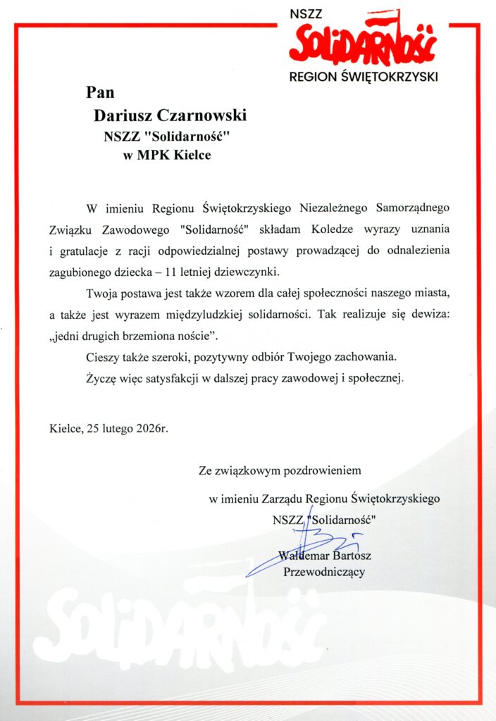 Medalem 45-lecia NSZZ „Solidarność” i Dyplomem uhonorowany został przez Region Świętokrzyski NSZZ „Solidarność” w dniu 25 lutego 2026r. Pan Dariusz Czarnowski, pracownik MPK Kielce i członek tamtejszej zakładowej organizacji związkowej „Solidarność” za działanie godne naśladowania skutkujące odnalezieniem zaginionej11-letniej dziewczynki.