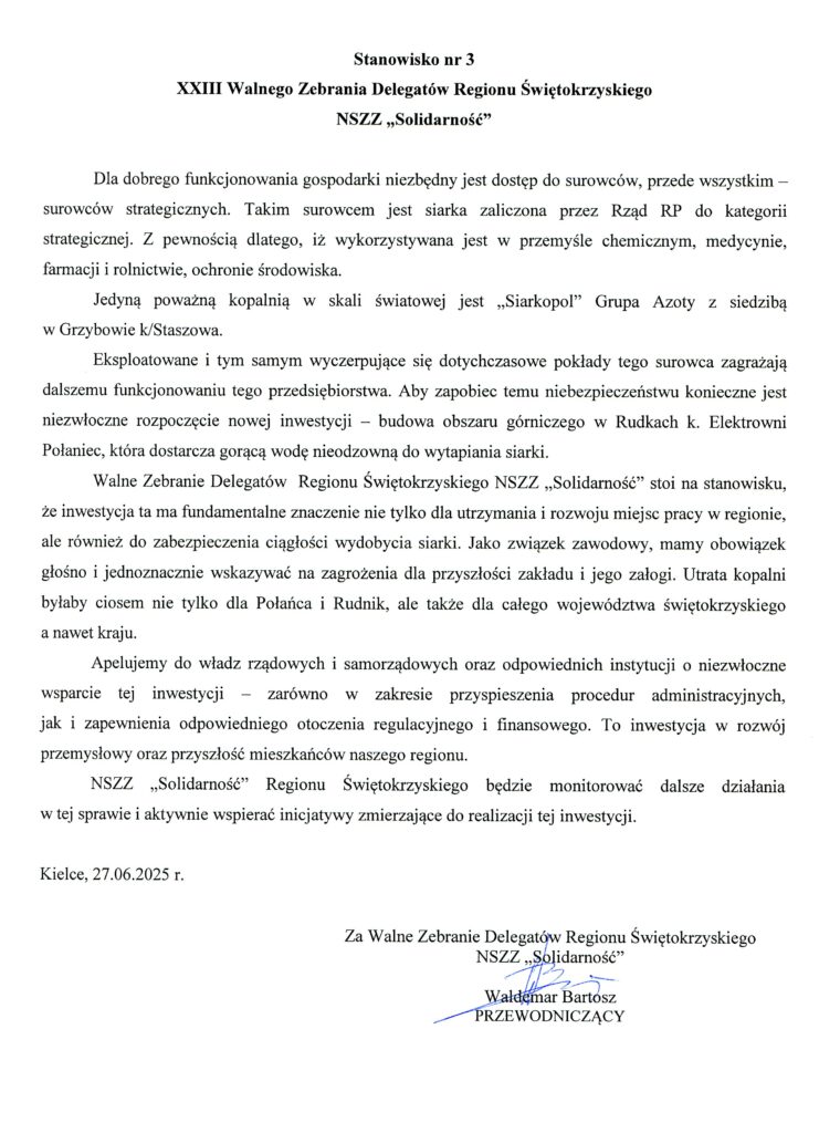 Walne Zebranie Delegatów Regionu Świętokrzyskiego NSZZ „Solidarność” stoi na stanowisku, że inwestycja ta ma fundamentalne znaczenie nie tylko dla utrzymania i rozwoju miejsc pracy w regionie, ale również do zabezpieczenia ciągłości wydobycia siarki. Jako związek zawodowy, mamy obowiązek głośno i jednoznacznie wskazywać na zagrożenia dla przyszłości zakładu i jego załogi. Utrata kopalni byłaby ciosem nie tylko dla Połańca i Rudnik, ale także dla całego województwa świętokrzyskiego a nawet kraju.