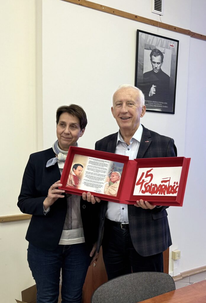 pamiątką związaną z tegorocznym jubileuszem 45-lecia NSZZ „Solidarność” z wizerunkami Świętego Jana Pawła II i bł. ks. Jerzego Popiełuszki.